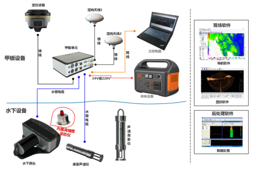 得益于海卓同創(chuàng)公司“慣聲一體”“小型化”“低功耗”的設(shè)計理念,MS400P(小精靈)整套系統(tǒng)的組成為:集成了慣導(dǎo)的水下聲吶探頭 + 集成了GNSS的甲板單元 + GNSS天線 +聲速儀,整套系統(tǒng)完整而又簡潔。